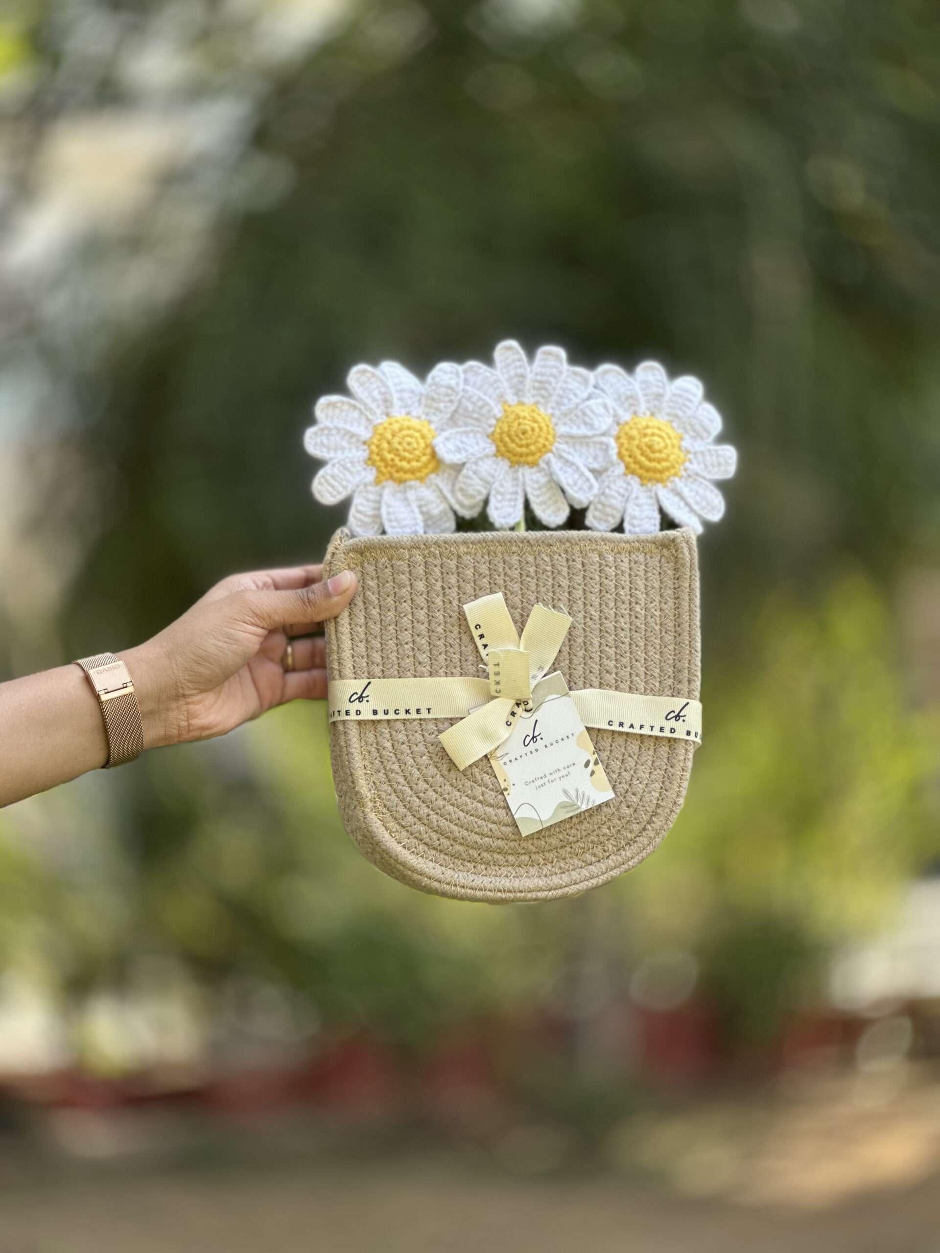 Transform any space effortlessly with our stunning floral arrangements. Featuring three knitted daisies these arrangements are presented in a stylish multipurpose jute arc shaped basket, tied with a graceful ribbon. No maintenance required, just instant beauty for your home.