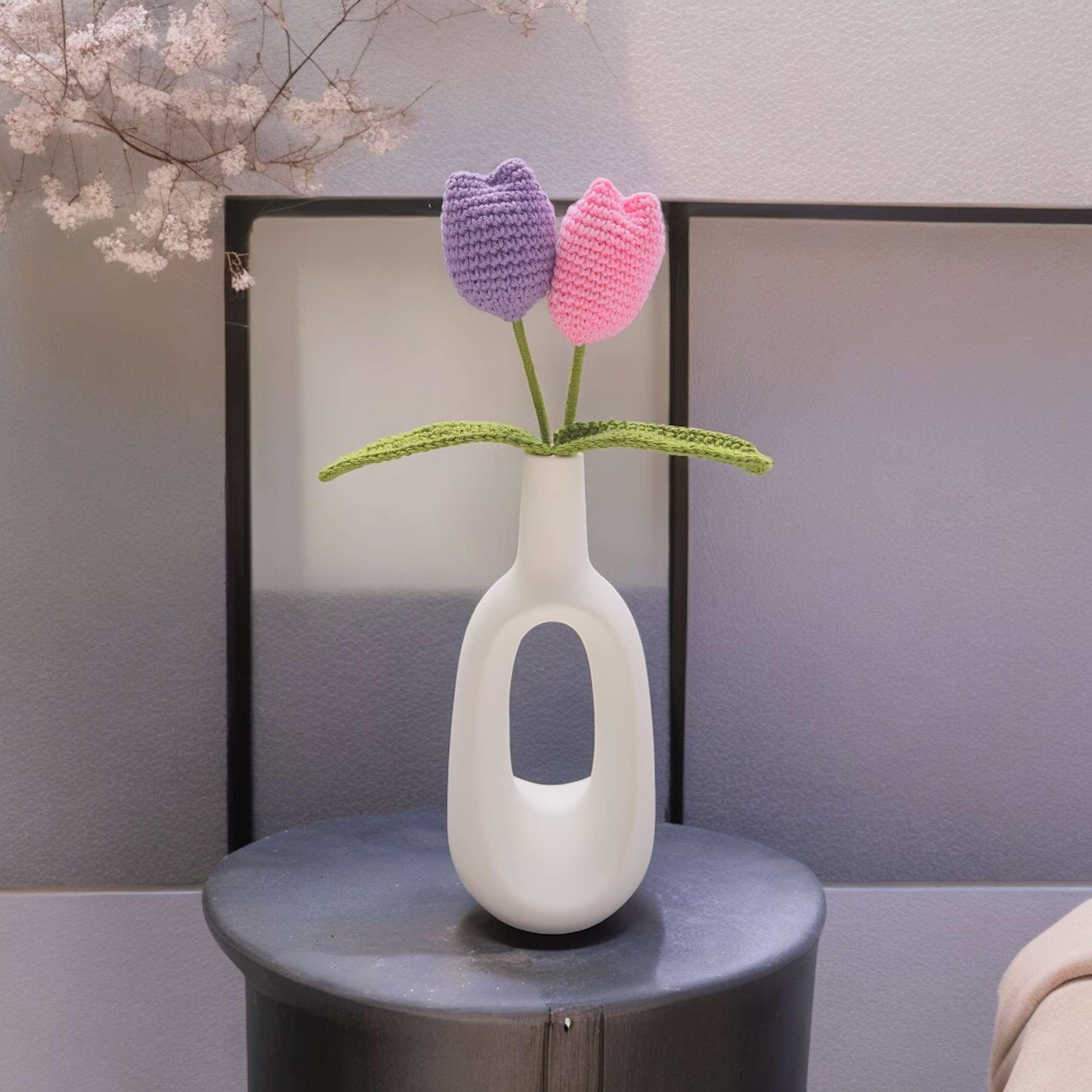mantelpiece, dining table, or as a centerpiece in your living room, our crochet tulips and white vase set